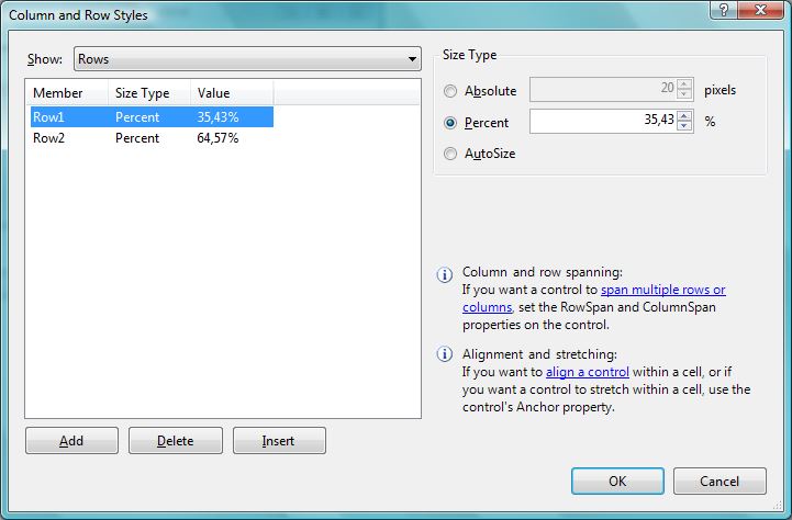 Выделяя строку или колонку в левом списке, справа вы можете задать ее размер в абсолютных значениях (Absolute) или в относительных (Percent). Если размер не имеет значения, то можно выбрать AutoSize, чтобы система пропорционально поделила пространство. Слева внизу есть кнопки для добавления в конец списка, удаления и вставки в текущую позицию новой строки/колонки.