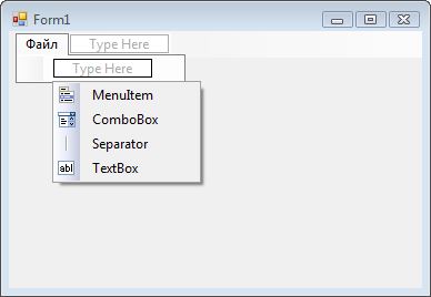 Если выделить компонент, то слева появятся светлый прямоугольник и серая надпись внутри Type Here (Напечатайте здесь). Если щелкнуть по этому прямоугольнику, то в нем появится маленькое поле ввода, в которое можно ввести имя нового пункта меню. Введите Файл и нажмите клавишу