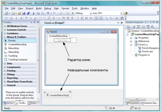 Создание контекстного меню идентично созданию пунктов главного меню. Создаются элементы одного и того же класса — ToolStripMenuItem, поэтому нет смысла повторяться и снова рассматривать его свойства.