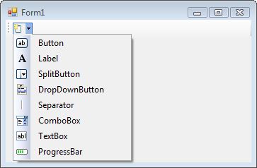 При щелчке по самой виртуальной кнопке будет создана кнопка класса ToolStripButton на поверхности панели. Если вызвать выпадающее меню, то в нем можно выбрать тип создаваемого компонента на поверхности панели. Вы можете создать следующие типы компонентов: